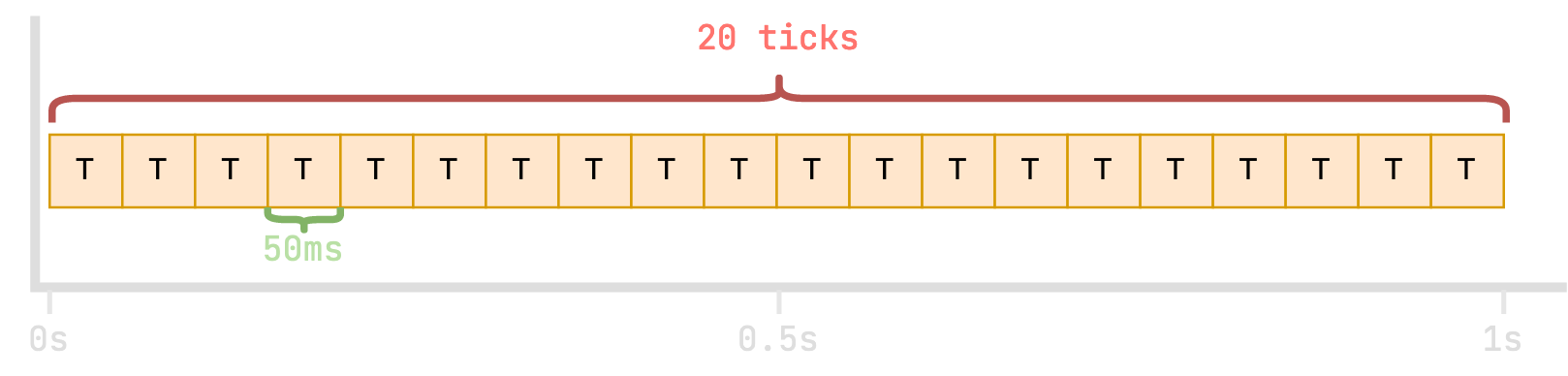 The Minecraft server aims to run exactly 20 of these game "ticks" every second, or in other words, one tick every 50 milliseconds.